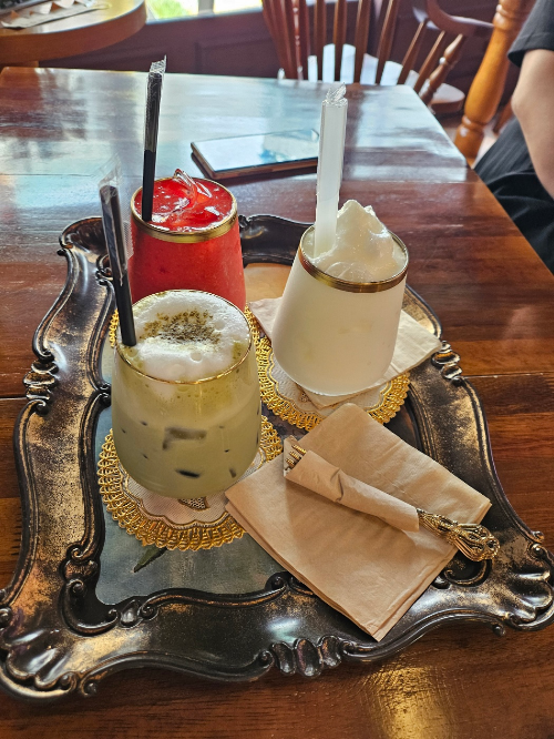 녹차라떼랑 플레인스무디 딸기를 시켰어요